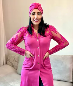 Jaleco confeccionado com gabardine premium com elastano, manga e detalhes em tule bordado. Possui modelagem acinturada, manga princesa e botões dourados em metal não oxidável. Turbante vendido separadamente.